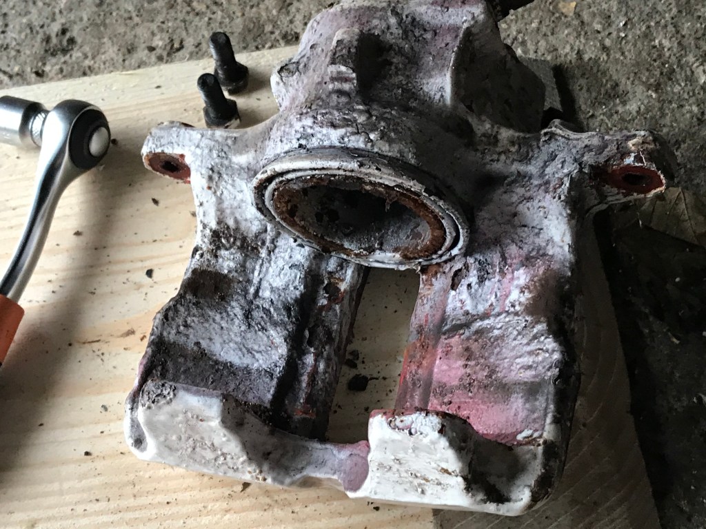 If I can identify the brake model then I can get a service kit and replace all the rubbers and the pins. I think it needs it! I’ll be focussing on sorting out the suspension first and then I’ll get to this.