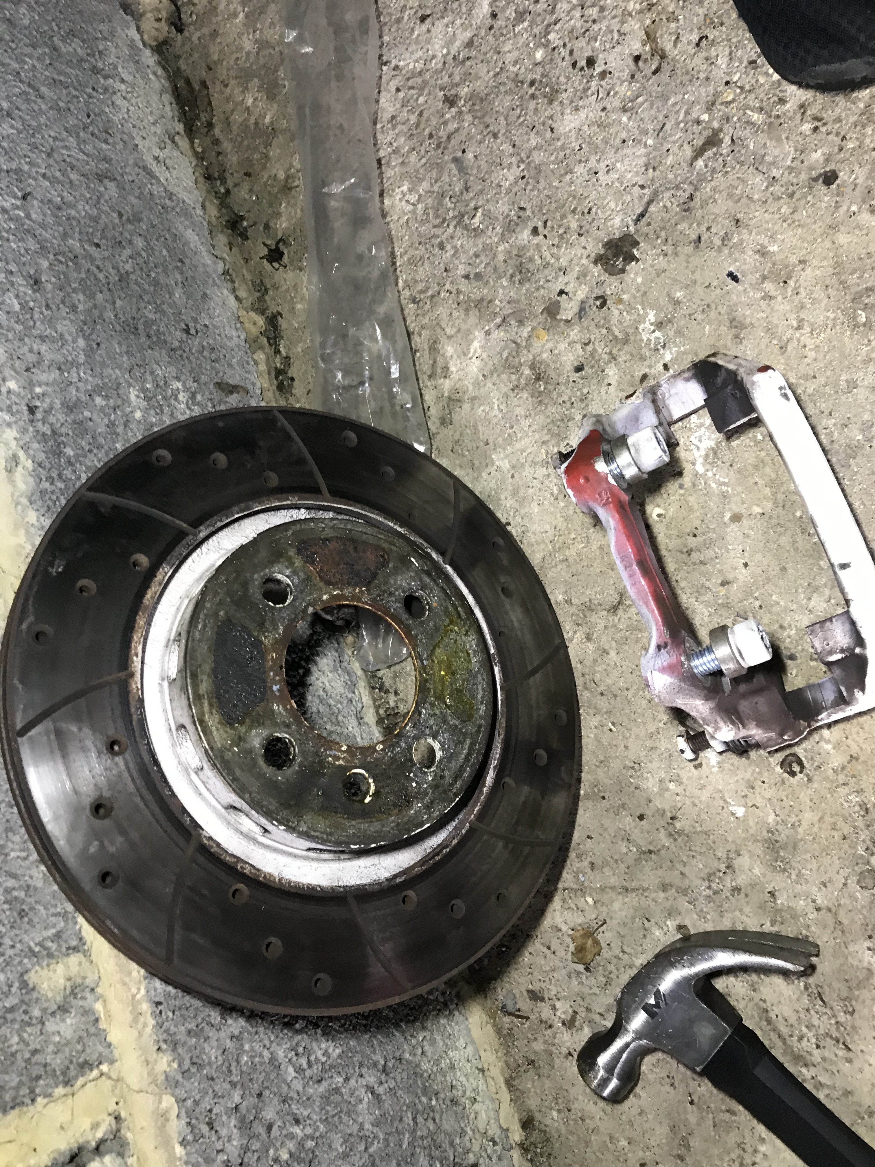 You can see the old calliper sat on the floor with easily enough slack on the brake line.