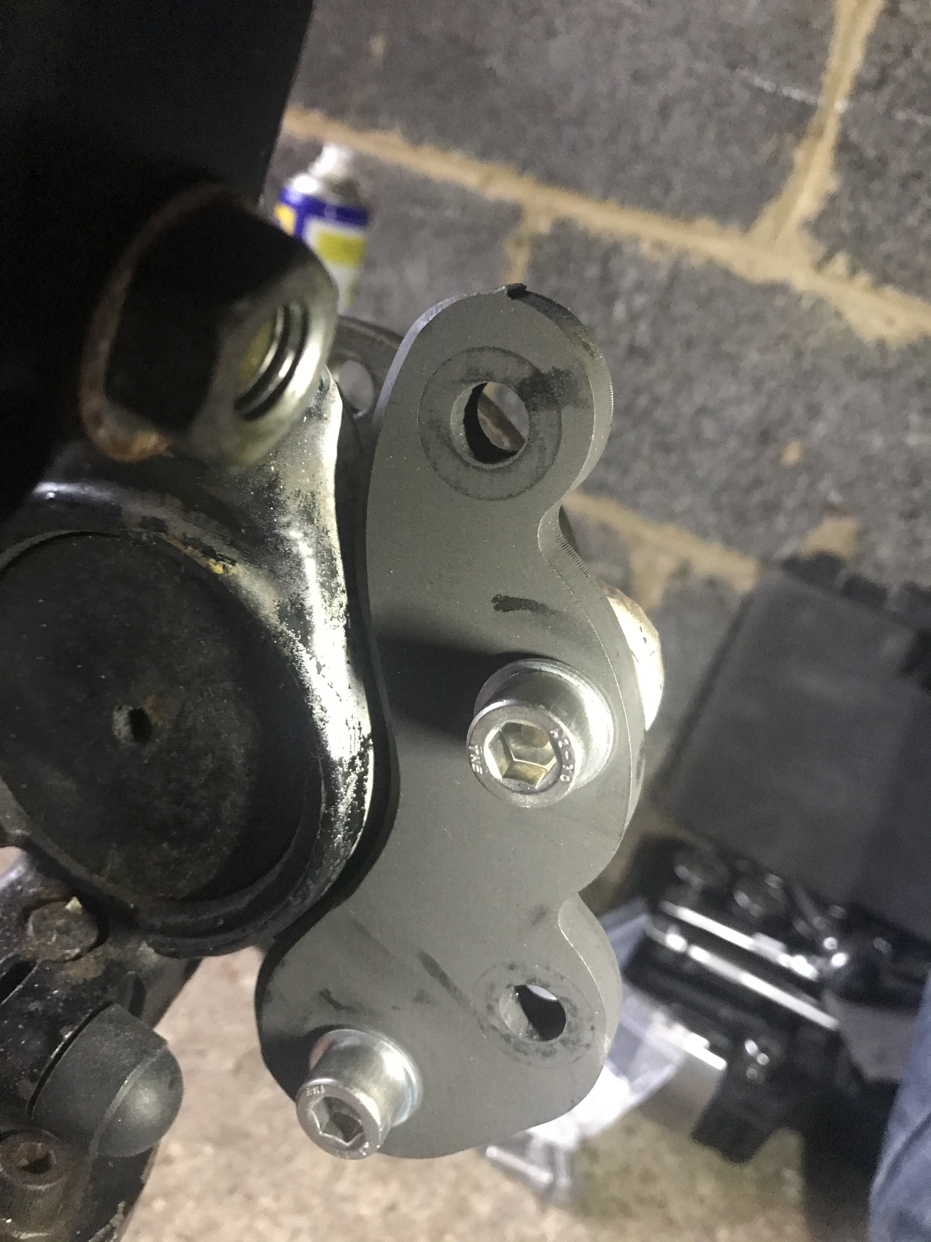 At this point I was still thinking that the mounting plate in the Tiger pack was going to fix to the calliper bracket. The job became more simple when I realised all of the old system is coming off. I had to nip to Halford to pick up a socket set with hex heads in. Thankfully each size had two different lengths because even with the bolt from the swivel column/pin out of the way, the column itself was still making access difficult.