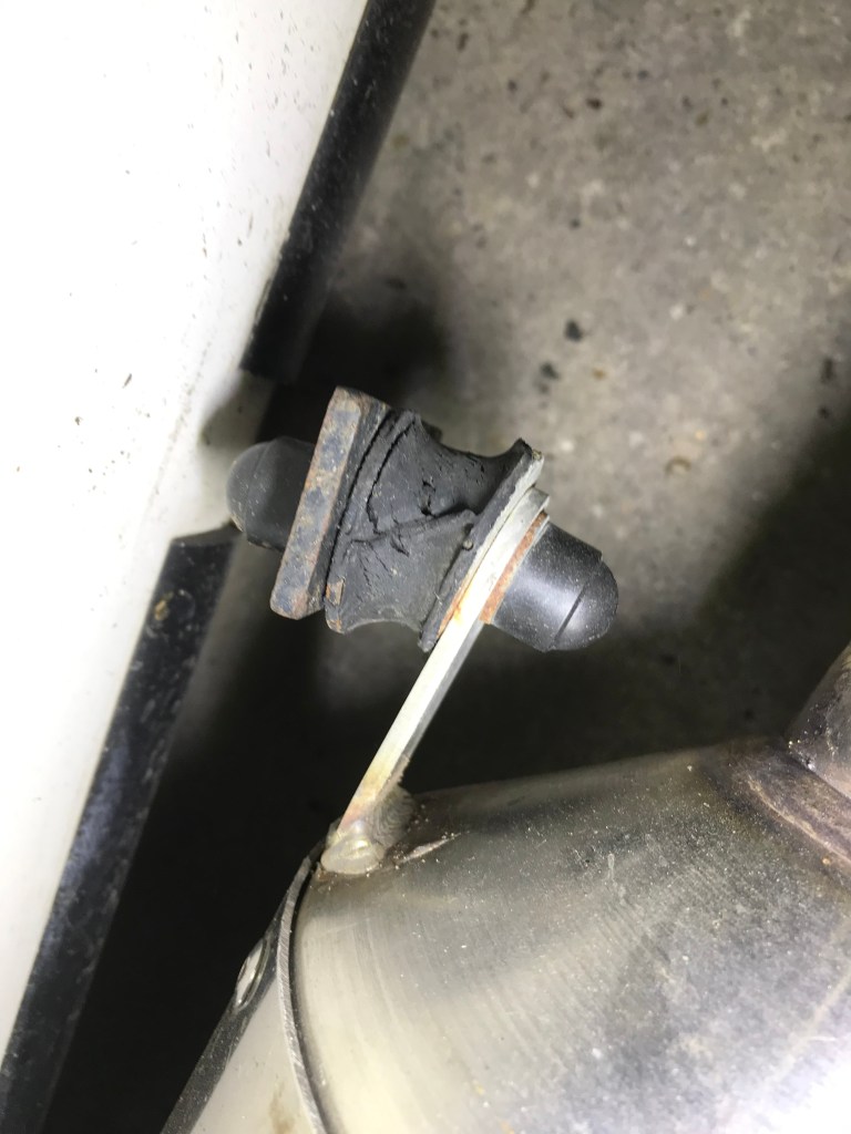 Okay so not really hanging low but almost hanging free. The Tiger Super Six exhaust runs down the side of the car. I understand which side depends on the engine. On the Zetec I have the exhaust is on the off side. The exhaust is supported by rubber mounts which, as well as providing the support, insulate the car from some of the vibrations of the engine. These had almost perished completely.