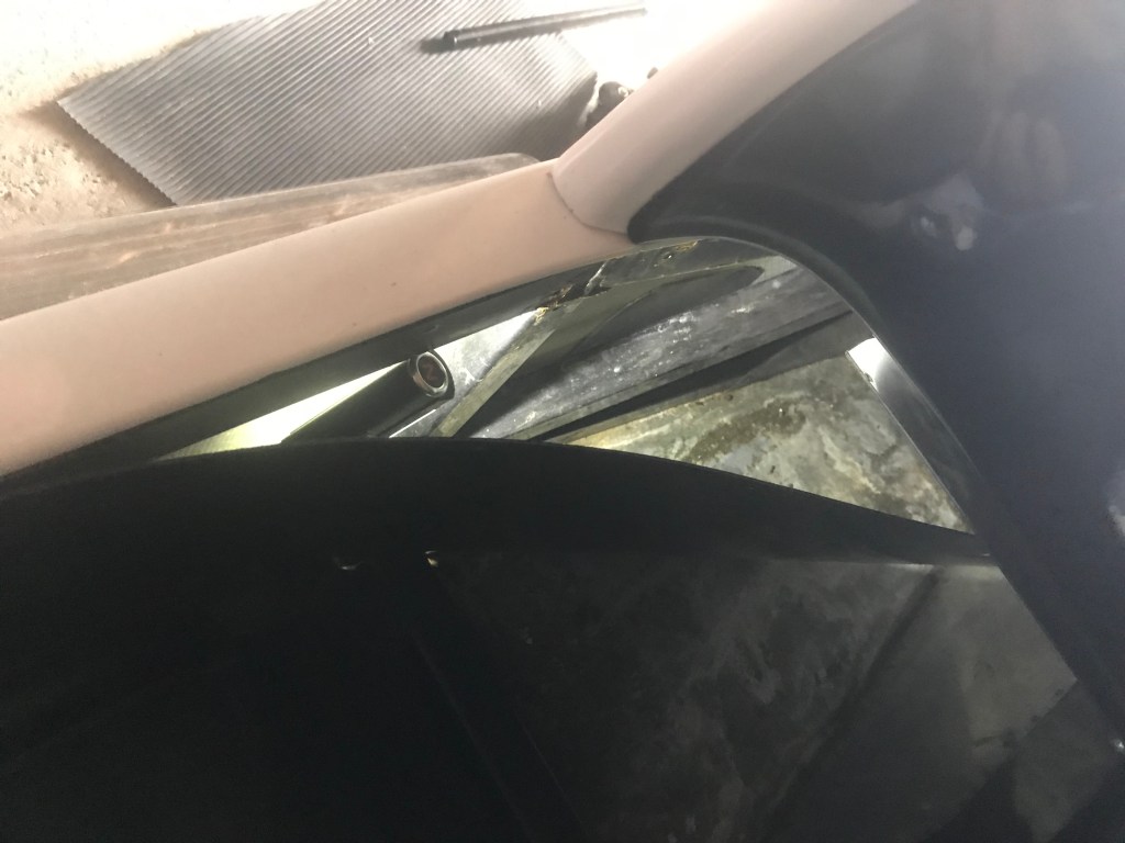 In order to see how the front mount was fixed to the body I removed the off side interior panel. This is held on with screws and whilst a little awkward is not too difficult. Access to the screw nearest the front of the car was restricted by a dash trim piece. I decided to remove the lower part of this trim piece to improve access. Judging by the wear marks on the screws holding the interior panel they have been on and off a fair bit. The front one has almost been stripped as it has been loosened and tightened with a screwdriver at an angle. I didn’t want to make this worse.