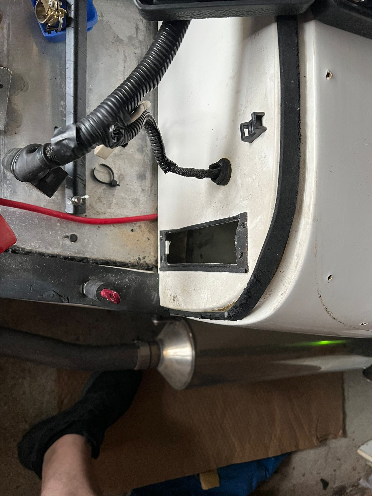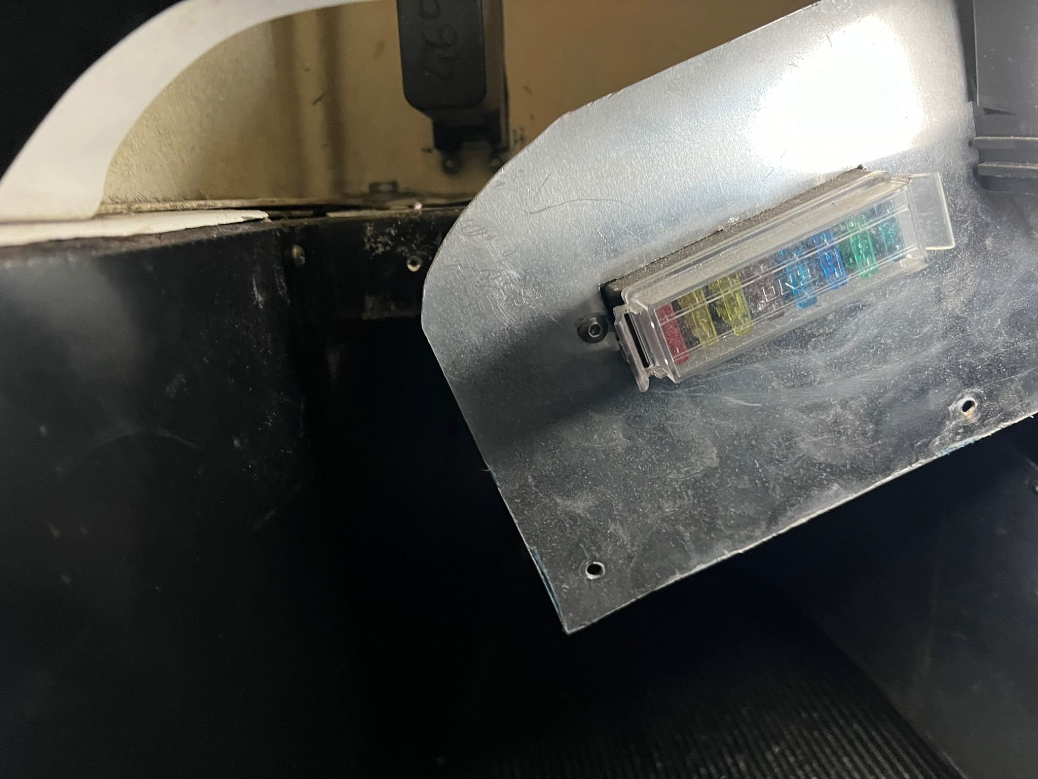 The scuttle is held on by only four bolts. On the driver’s side these were only marginally difficult to get to. On the passenger’s side they were a nightmare. In the area where a glove box would normally be, there was an aluminium panel holding the relays and fuses. This was riveted to the rest of the car. There was also the ECU in the way of the hardest to reach bolts.